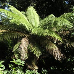 Native to coastal Australia/Tasmania. Its thick mass of roots eventually form a trunk, with large, long fronds growing from the crown. Grow in shade in moist soil. WATERING: Water the trunk first and then water the crown. Feed regularly through the crown. They can attain a height of 4m but are very slow growing. Although one of the hardier tree ferns, (down to -5), they may benefit from the crown being protected in winter with fleece, straw or even old fronds.