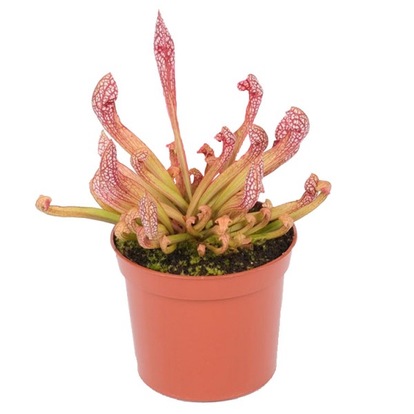 This stunning hybrid results from a cross between Sarracenia psittacina and Sarracenia leucophylla. Its distinctive calyx shape and striking contrasting colors set this trumpet cup plant apart from others in its group. It’s also well-suited for indoor cultivation, particularly in a south-facing location where it can receive ample sunlight. Ensure to water it with rainwater to maintain its health and vigor.